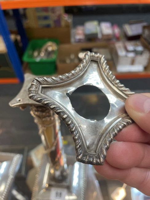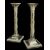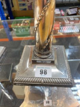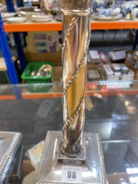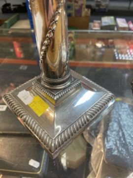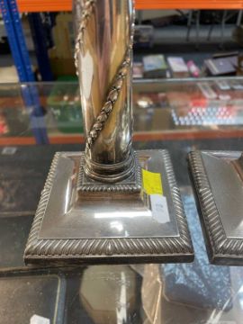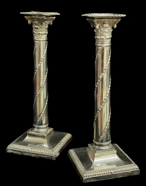 PAIR VICTORIAN SILVER CORINTHIAN CANDLESTICKS, Martin Hall & Co, London 1890, with bellflower spiral ornament, gadrooned square bases, loaded, 27.5cm h (2)Comments; one sconce torn,Condition Report:lots of general wear.Dents and dings on both