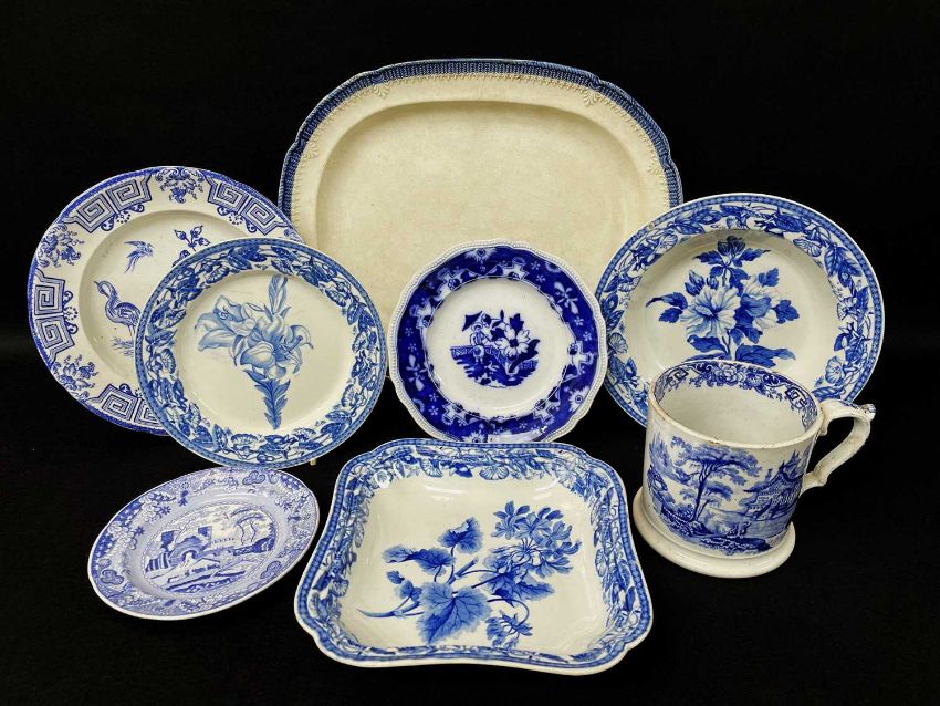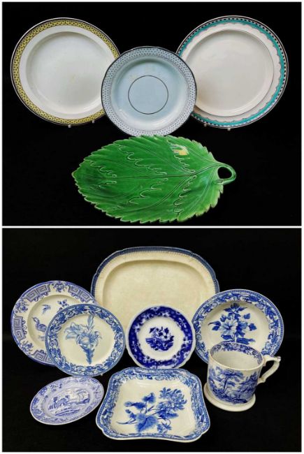 GROUP OF 19TH CENTURY WELSH POTTERY, comprising late 18th / early 19th Century pearlware plates, one with impressed mark 'Dillwyn Swansea', another with diamond mark, together with a green glazed earthenware leaf moulded dish and a Swansea 'Whampoa' oversized tankard, an 'Oriental Birds' plate, a Dillwyn platter ETC (12)