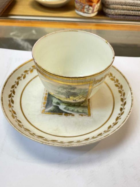 LARGE GROUP OF 19TH CENTURY TABLEWARE mainly cups and saucers, including Pinxton cup and saucer, Mandarin decorated tea-bowl, saucer and jug, pair of spuriously marked Swansea coffee cans and saucers etcProvenance: private collection SwanseaComments: please examine / enquireCondition Report:One yellow coffee cup has a crack and chip.The cream jug has wear to the decoration.The Pinxton cup and saucer has extensive decoration wear. No chips or cracks.The larger mug has a hairline crack.The Spode cup and saucer, the saucer has a hairline crack, the cup is good.Another non-matching cup and saucer has a star-shaped crack, saucer ok.The set of three matching, one saucer has a chip and a crack.All other pieces not mentioned are good, just dirty.