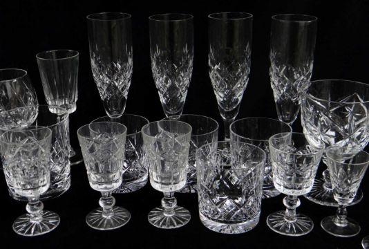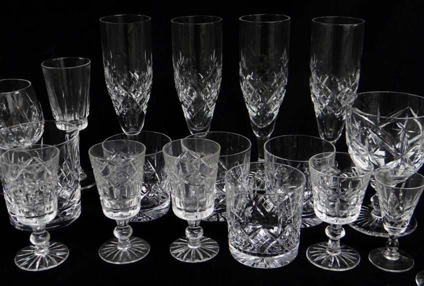 LARGE QUANTITY OF MODERN CUT TABLE GLASS, various makers, many different patterns including sets and part suites of champagne, wine, brandy, liquor, red wine, white wine, whisky, water glasses ETC