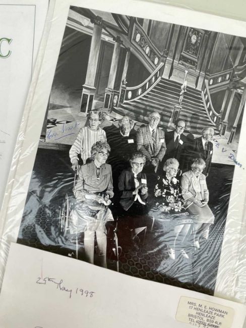 TITANIC INTEREST: 1986 phtograph of 7 Titanic survivors, autogrpahed by Bertram Dean & Eva Hart, together with B.T.S Convention programme dated 14 April 2000, two letters from Margaret Howman, daughter of Cdr. Rostron of the Carpathia, 2 x 3in. black & white photo of the same, and a facsimile of a Marconi telegram from the Carpathia to Paris, 8.10am, 8 April 1912 with meassge 'Sauve Cendresses' (6)Provenance: Ex lot 2, Henry Aldridge & Son 18 Sept 2004