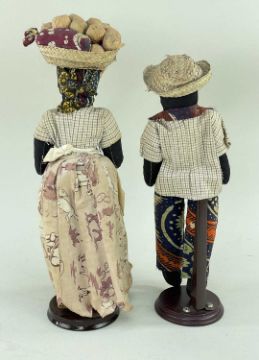 PAIR OF CLOTH DOLLS AS CARIBBEAN PLANTATION WORKERS the larger female with head-basket of picked produce, the smaller male in straw hat and exotic pants, believed early 20th Century, on later stands, 35cms and 30cms high