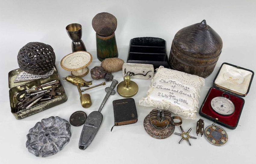 VARIOUS CABINET OBJECTS OF CURIOSITY including sequined cushion 'The Marriage of James and Sarah 24th May 1884', a tobacco tin of old keys, pocket-barometer, invalid spoon, knife sharpener, primitive rattle ball, brass pocket button-hook, wooden spinning top, etc