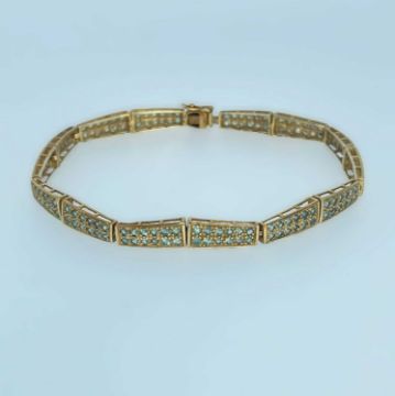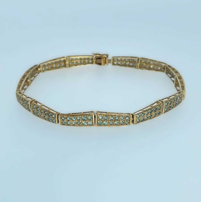 9CT GOLD PANEL BRACELET set with green gems, likely Alexandrites, 20cms long, 9.4gms, in associated boxProvenance: private collection Bridgend County Borough, consigned via our Carmarthen Office