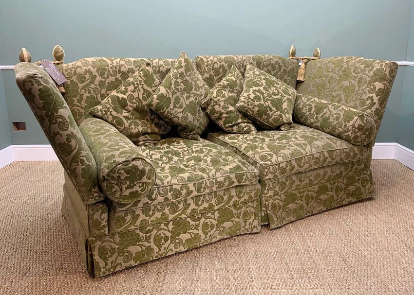 MODERN KNOLE 8FT SOFA, by 'Original Homes of Elegance', drop flap sides with bud finials and rope ties, feather-filled cushions and bolsters, upholstered in green Mulberry 'Baroque Vine' damask type fabric, 244w x 93d x 114cm h (in 2 pieces)