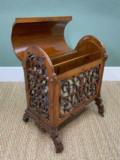 VICTORIAN BURR WALNUT ARCH-TOP MUSIC CANTERBURY, the hinged lid above fretwork sides on shaped legs, castors, 59 h x 48 w x 24cms d