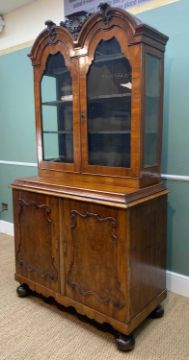 DUTCH WALNUT CABINET, the upper portion with double domed cornice, glazed panel doors, on an associated base with cavetto moulded cornice above figured doors applied with scroll moulded framework, on cut-away plinth and replacement bun feet, 208.5 h x 106 w x 57cms d