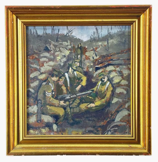 EARLY 20TH CENTURY BRITISH SCHOOL oil on board - WWI trench scene with British soldiers resting, unsigned, 31 x 29cms