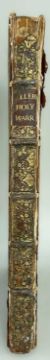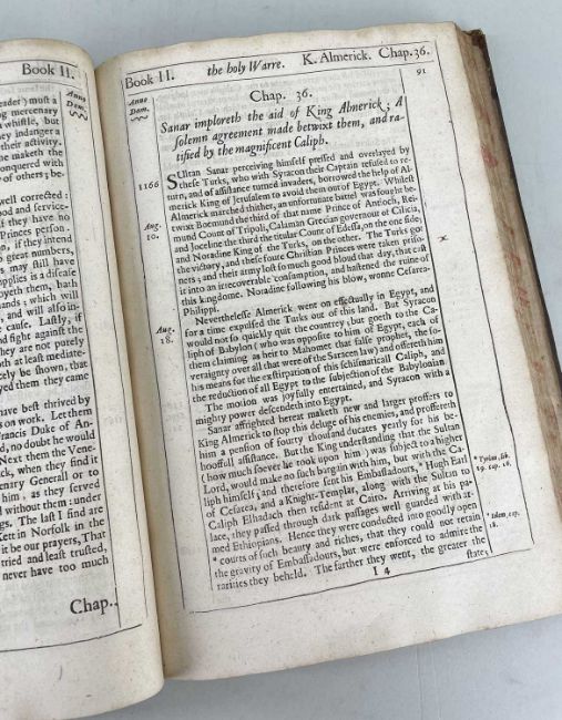 (BOOK) THE HISTORIE OF THE HOLY WARRE by Thomas Fuller, complete with engraved frontispiece and fold-out map of the Holy Land (Roger Daniel, 1647), full leather bound, ribbed spines with foliate gilding. gilt lettered title bandComments: binding poor but interior much better, tear to fold-out map but in good condition overall