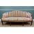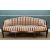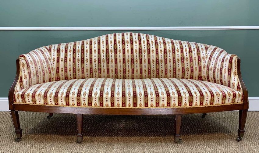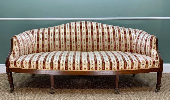 GEORGE III STYLE MAHOGANY SOFA, with padded camel back, arms and seat, four front square tapering legs with caps and castors, re-upholstered in striped brocade, 77.5 h x 174cms w