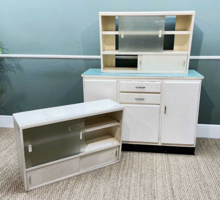 THREE VINTAGE 1960s KITCHEN CABINETS, comprising pair of glazed wall cabinets and Formica topped floor cabinet fitted with drawers and cupboards, floor cupboard 120 x 43 x 86cms h (3)