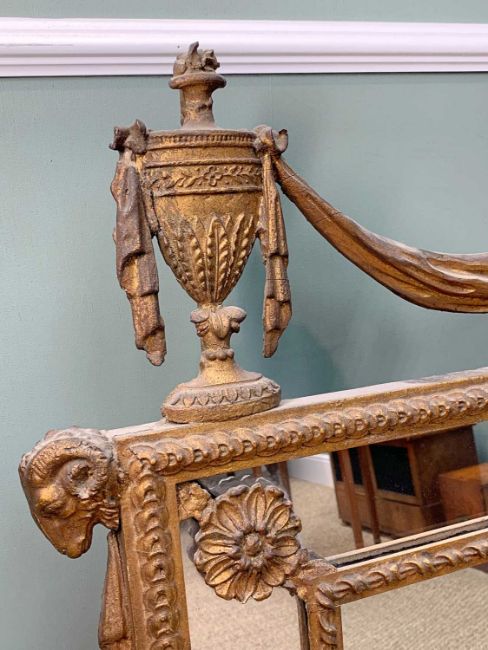 GEORGE III-STYLE GILTWOOD & GESSO OVERMANTEL MIRROR, with urn & drapery swag pediment, the marginal mirror border punctuated with rosettes, 95 h x 128cms w