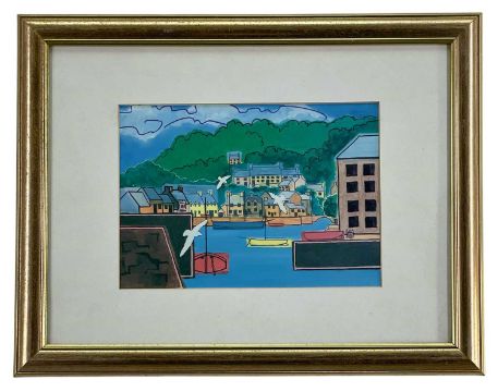 STAN ROSENTHAL coloured print - harbour scene with anchored boats, unsigned
