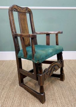 RARE WELSH JOINED OAK CHILD'S ARMCHAIR early 18th Century and later, believed Carmarthenshire, carved top rail and stretcher, cushioned stuff-over seat