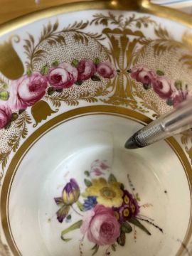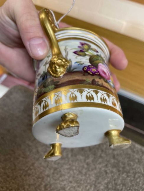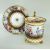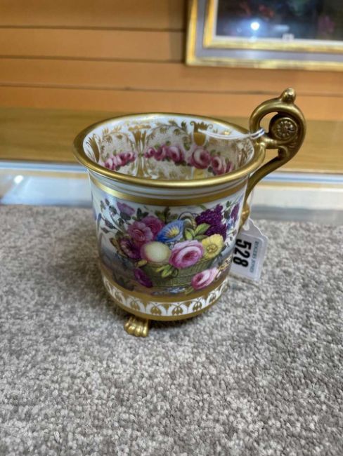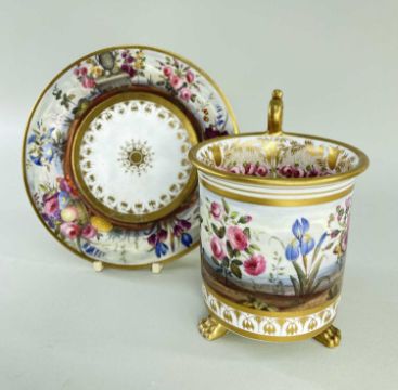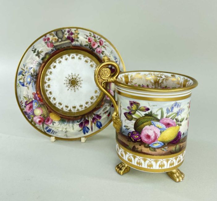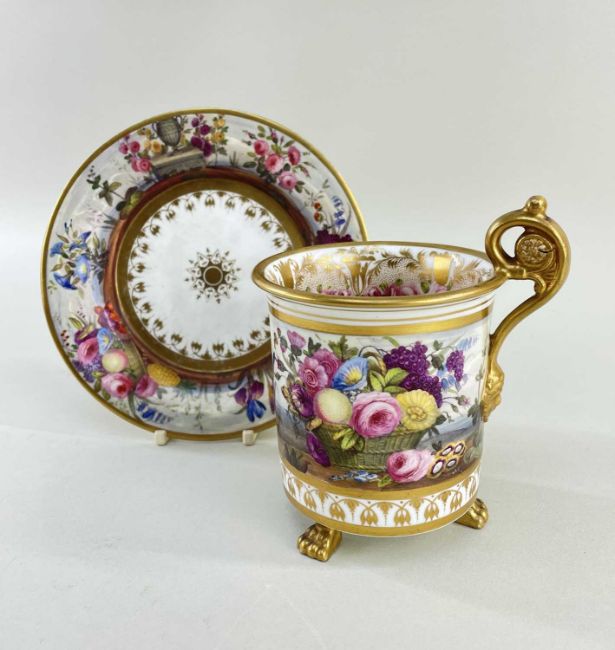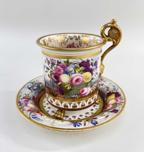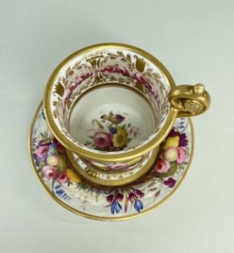 AN EXCEPTIONAL & RARE 'OVERSIZE' SWANSEA PORCELAIN CABINET CUP & STAND circa 1815-1817, the cup with everted rim and raised over three paw feet, the mask-head handle scrolling to a floral disc terminal, the rim, handle and paws picked out in gold and lavishly decorated by Robins & Randall, Islington. To the exterior of the cup an overflowing basket of flowers and an arrangement of fruit and flowers with wild growing flowers in between to a continuous country-landscape and sky, the decoration repeated on the border of the stand, the interior of the cup with a continuous wreath of open roses and gilt decoration and a spray of colourful flowers centred in the bottom, cup 12cms high x 9cms diam, stand 16cms diam
