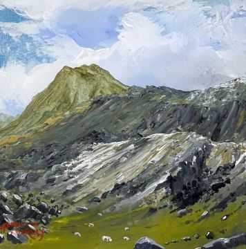 PETE TURLEY oil on card - sheep grazing on Snowdonia hillside, signed