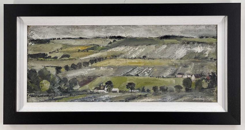 JOHN KNAPP-FISHER oil on board - expansive view across valley with farm buildings and fields, signed and dated 1964