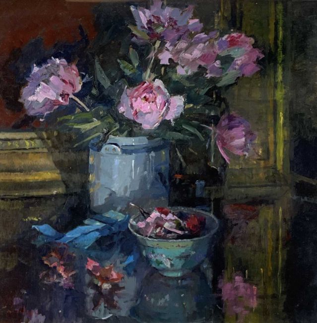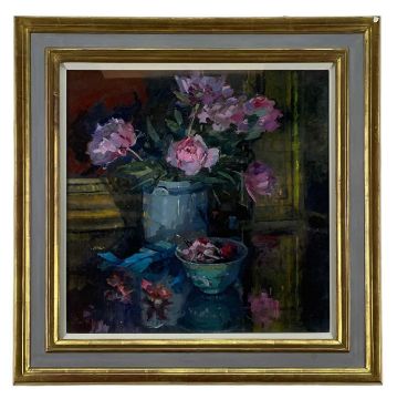 JANE CORSELLIS oil on canvas - still life of flowers in a vase on a table with small bowl, entitled verso on Albany Gallery label 'Peonies', signed
