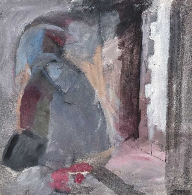 GEORGE CHAPMAN four oils on canvas - unfinished compositions including figure walking, colliery, lady with shopping bag and figure with umbrella in the rain (4)