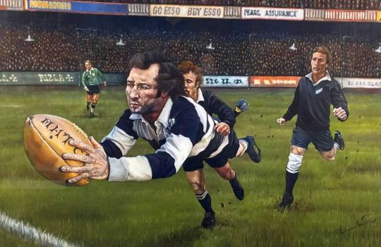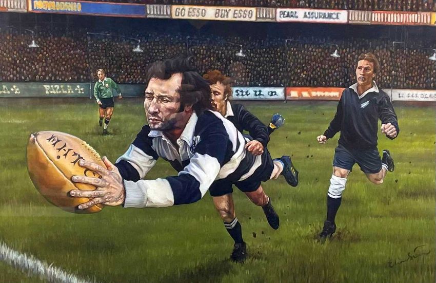 consigned by 'The Greatest Try' charitable organisation, the painting from the print was unveiled by Sir Gareth Edwards CBE at Cardiff RFC on July 6th 2022 during a press conference for Sir Gareth's 75th birthday and the upcoming 50th anniversary of 'the greatest try' in the 'greatest ever match'