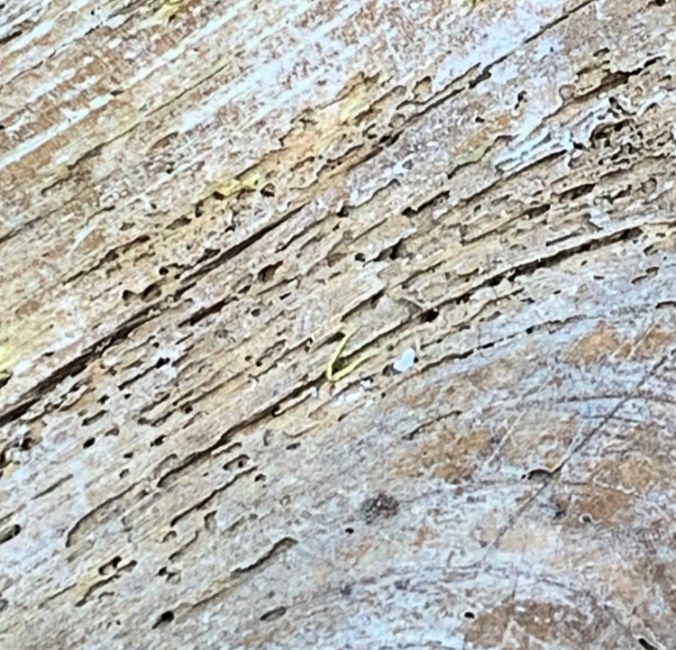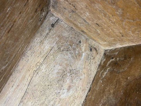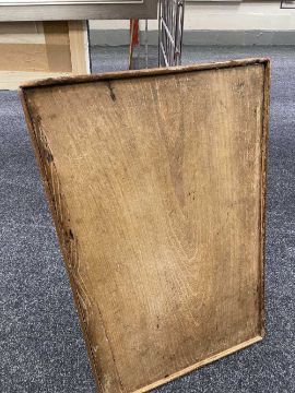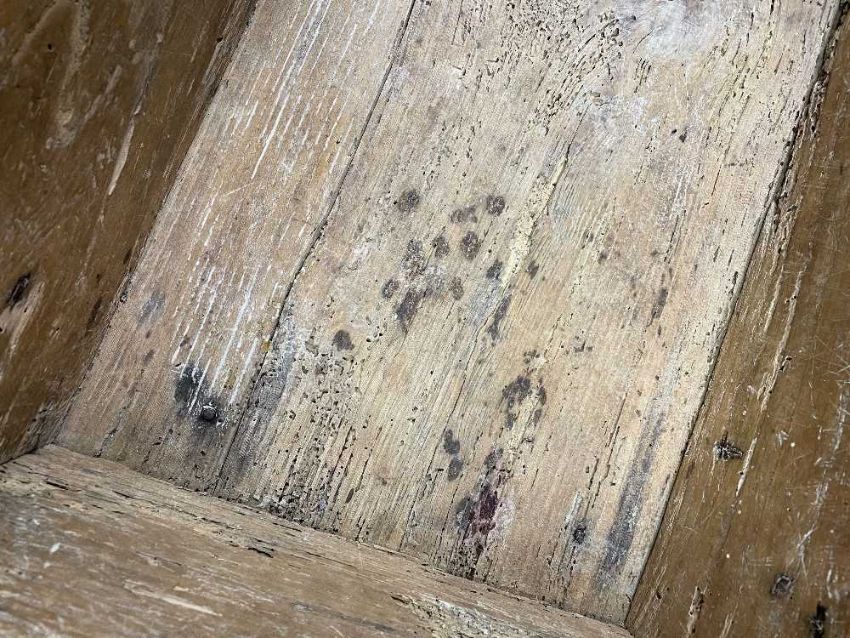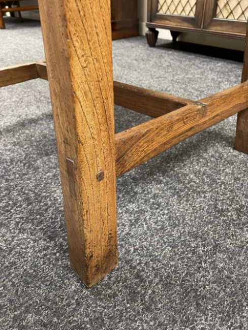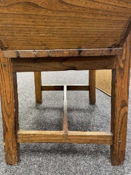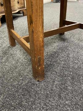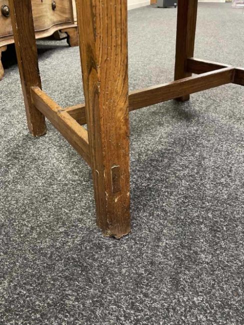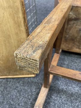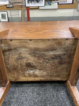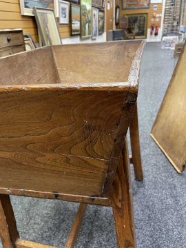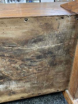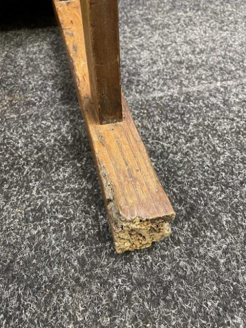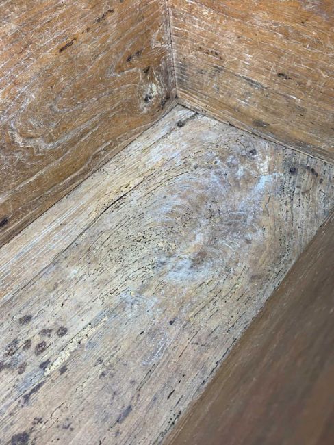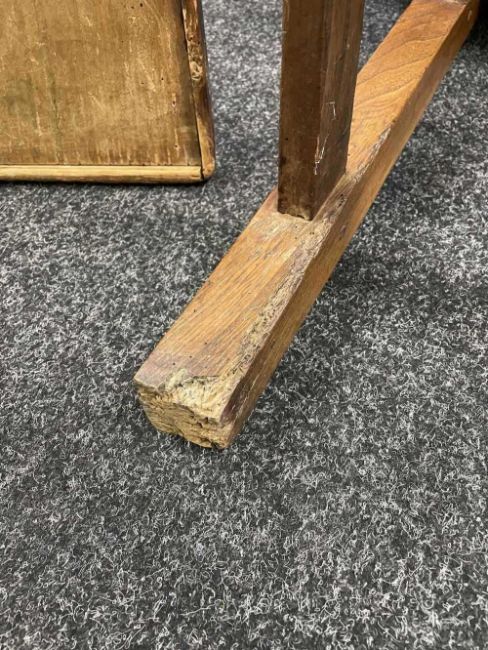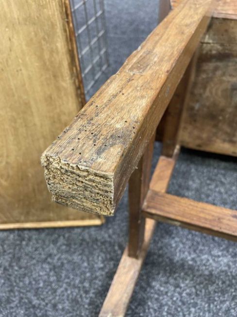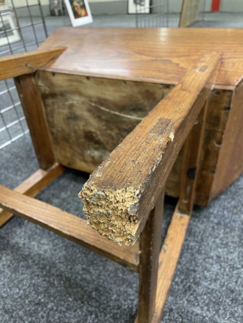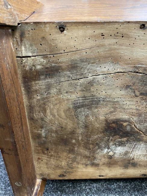 There is old damage and worm to the base of the bin, legs and stretchers.