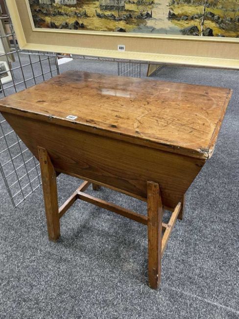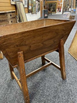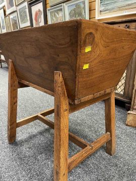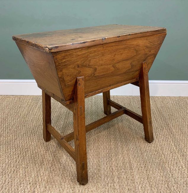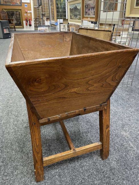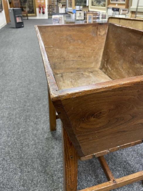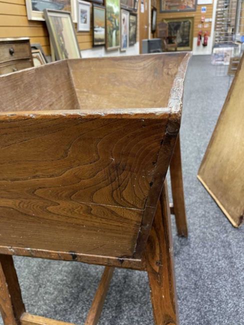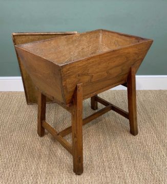 WELSH OAK STANDING DOUGH BIN early 19th Century, lift-up cover, on splayed legs. h-stretcher