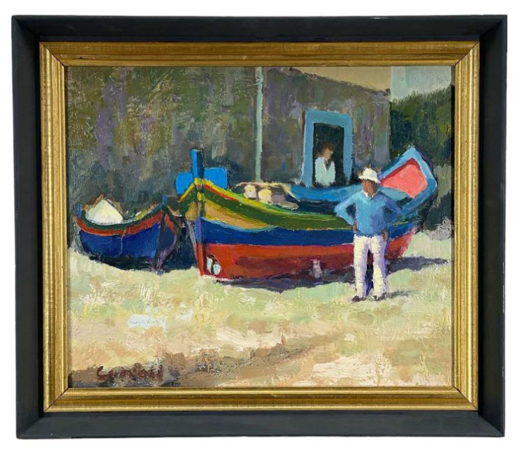 LEO CARROLL oil on board - figure standing alongside fishing boat, entitled verso 'Safe Harbour', signed