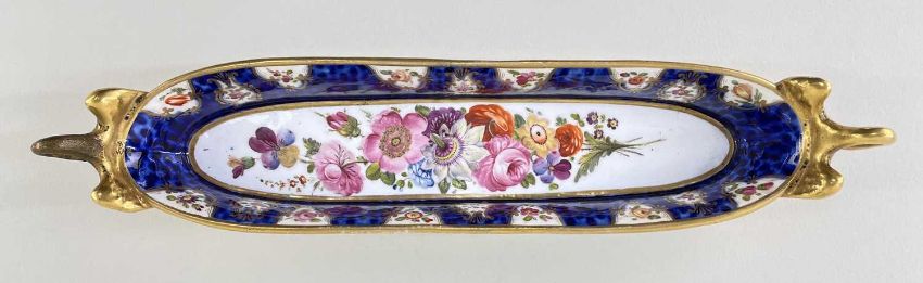 SWANSEA PORCELAIN PEN TRAY circa 1815-1817, having twin handles in the form of swans with outstretched wings and with repeated raised ovals above the foot rim, the interior base with large full spray of flowers, deep blue reserves to the exterior and interior sides, containing cartouches of flowers to the interior, and floral gilding to the exterior, the swans and other areas picked out in gold, 25.5cms