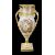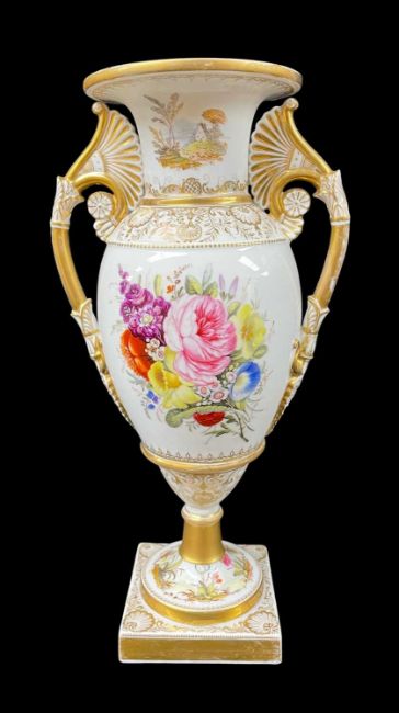 FINE & RARE SWANSEA PORCELAIN VASE circa 1817-1820, of slender ovoid shape with a round pedestal base mounted on a square plinth, moulded lotus flower handles with small floral embossed medallions, the base of the handles terminating with embossed acanthus leaves, the body decorated with a vignette of three figures in a landscape being a pastiche of Jean-Honoré Fragonard’s 'The Swing', to the reverse a large spray of colourful flowers, further floral decoration to foot and to neck, 26.5cms high