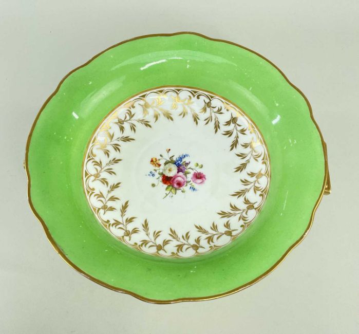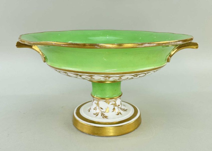 SUBSTANTIAL NANTGARW PORCELAIN TAZZA circa 1817-1820, of lobed circular form over a knopped pedestal base with spreading foot, twin handles curving downwards, in apple-green ground and with centred floral spray to the interior within a border of repeating gilt scrolls and foliage to match stem, solid gilt rims, 30.5cms handle to handle