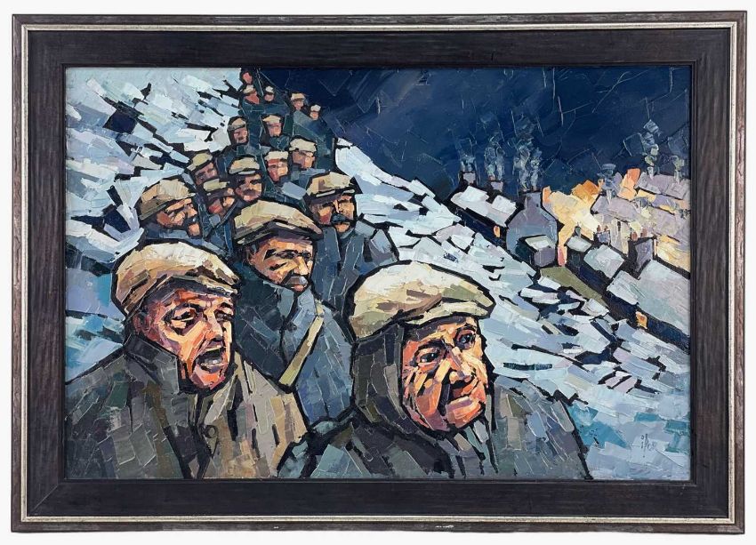 IFOR PRITCHARD oil on canvas - line of quarrymen walking on a path above village, 'Wending Home', signed