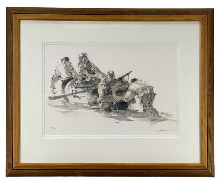 WILLIAM SELWYN limited edition (92/500) colour print - four fisherman manouevering a rowing boat on the Menai Straits, signed fully in pencil