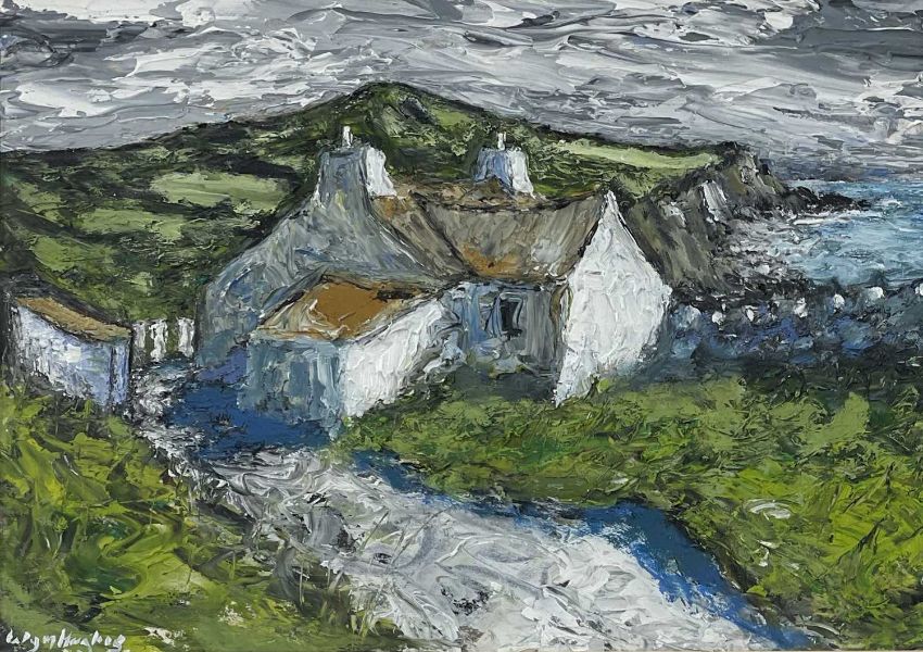 WYN HUGHES oil on board - view of Anglesey coastal cottage, entitled verso 'Ty'n Towyn, Ynys Mon', signed