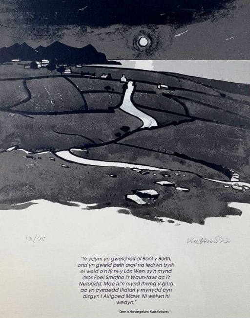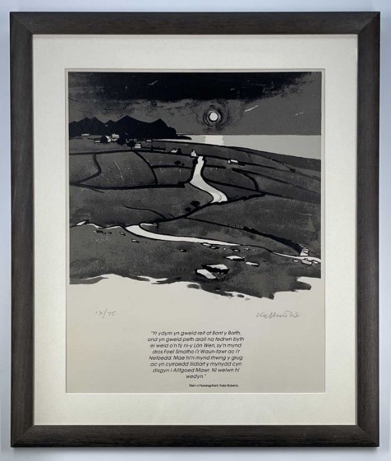 SIR KYFFIN WILLIAMS RA limited edition (13/75) print - Caernarfonshire coast with the rivals at moonlight and seven-line poem by Welsh novelist Kate Roberts, signed in full, accompanied by a signed Christmas card by the artist with thanks for a book token (2)