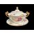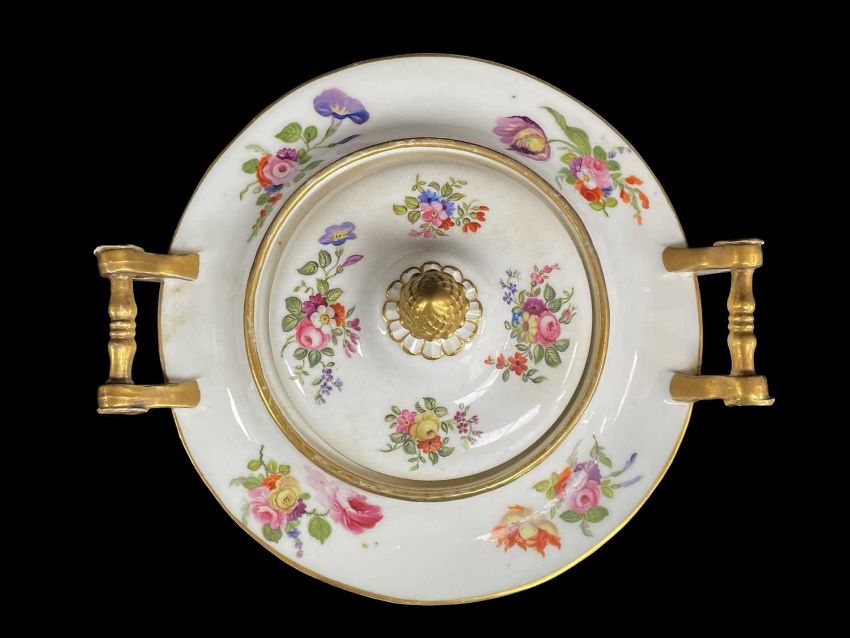 FINE SWANSEA PORCELAIN SAUCE TUREEN, COVER & STAND circa 1817-1820, circular based, non-moulded body, upturned spindle handles with rosette disc terminals, dome top with pineapple finial, finely painted all round with sprays of flowers, and with handle, rim and finial picked out in gold, impressed and scripted Swansea marks, handle to handle 18cms