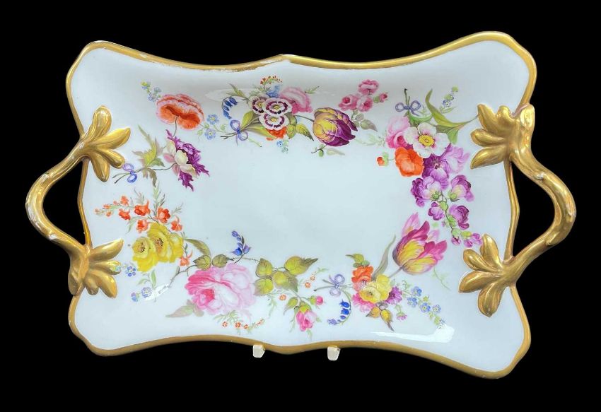 FINE SWANSEA PORCELAIN TWIG-HANDLED DISH circa 1815-1817, rectangular shape with gilded twig handles, painted by David Evans with bouquets of circling flowers tied with purple ribbons within a solid gilt rim, Swansea script mark to base, 28cms handle to handle