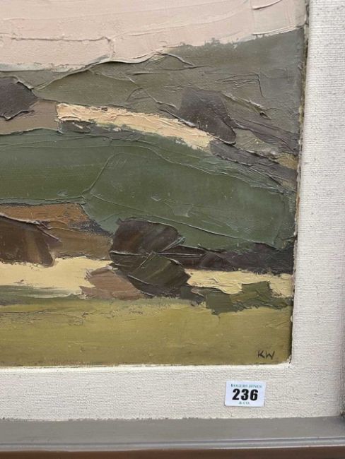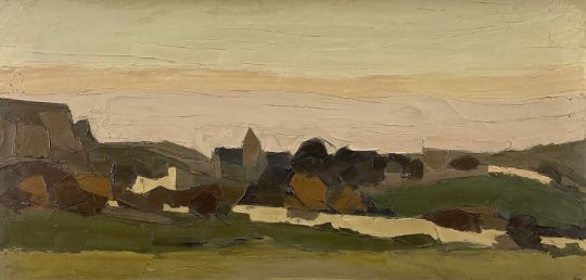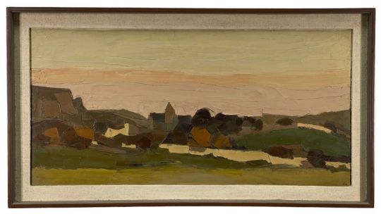 SIR KYFFIN WILLIAMS RA oil on canvas - sunset over Ynys Mon (Anglesey) village, entitled verso Penmon, circa 1970s, signed with initials