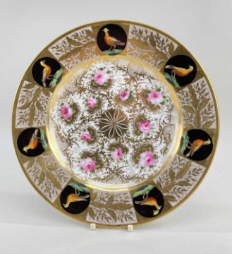 RARE NANTGARW PORCELAIN PLATE circa 1818-1820, the interior decorated with a formal arrangement of pink roses surrounded by elaborate gilding, the border with a series of seven colourful birds on an intense black background alternating with tinted panels with gilded foliage, 23cms diam