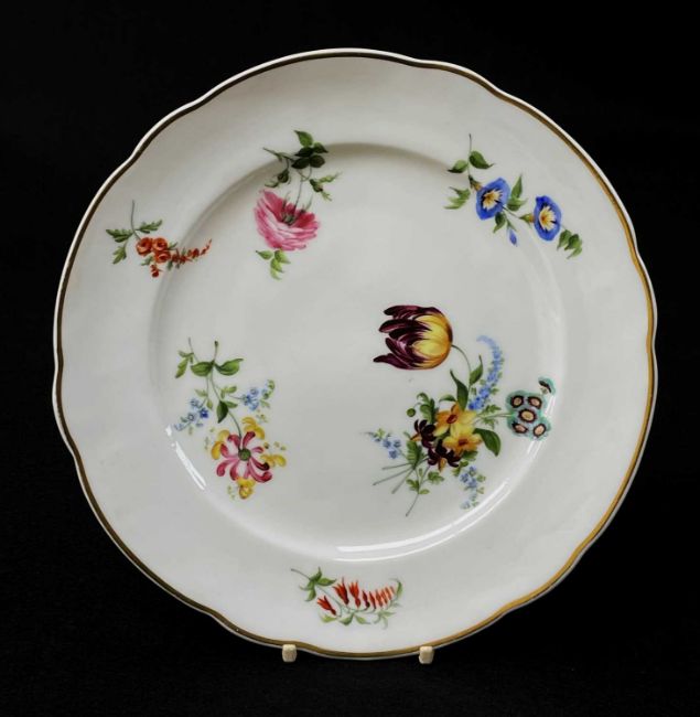 NANTGARW PORCELAIN PLATE circa 1818-1820, having a wavy border, painted with six scattered flower studies, impressed NANT GARW CW to base