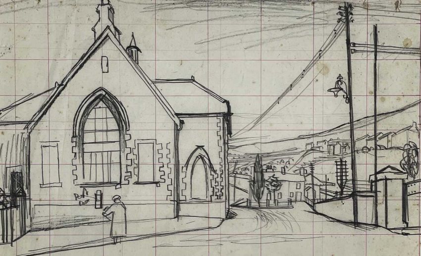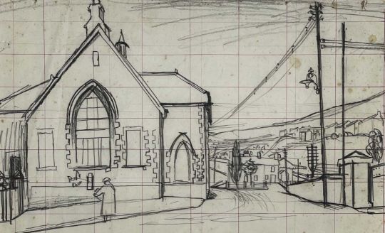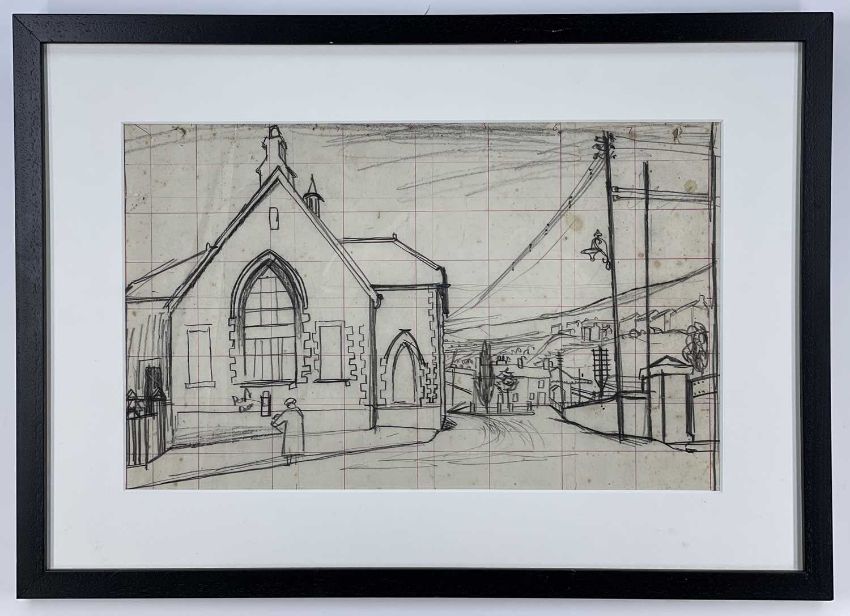 GEORGE CHAPMAN preliminary pencil drawing on gridded paper - South Wales village or town with church and figure Dimensions: 26 x 41cmsProvenance:consigned by the granddaughter of the artist via our Cardiff officeCondition Report:framed and glazed, paper with surface marks (possibly the artists' paints), creases and damage to paper at corner