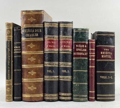 GOOD GROUP OF WALES RELATED ANTIQUARIAN BOOKS each with good bindings, including Amy Dillwyn’s novel ‘The Rebecca Rioter’ (vols 1-2) (London 1880) being the story of a famous attack on the Pontardulais toll gate by the Rebecca Rioters, and written from a rioter’s perspective. The author’s support to their cause is evident; also ‘The Civil War in Wales’ (vols 1-2), ‘Geiriadur Charles’ (Wrexham 1875) finely bound, and ‘Memoirs of Owen Glyndower (Owain Glyndwr)’ (Haverfordwest 1822), (8 x books total)
