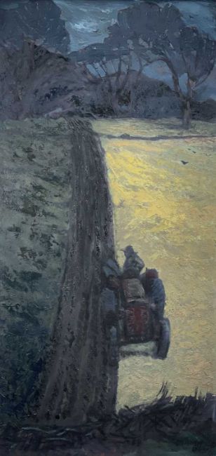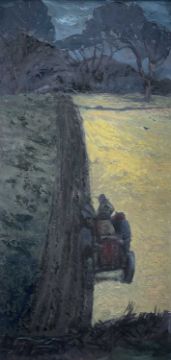 CHARLES WHITE oil on board - farmer on tractor ploughing field, entitled verso on Royal Society of Arts 1966 label 'Early Ploughing', signed and dated '62