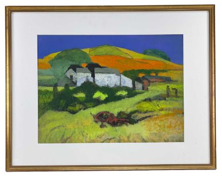 JOHN ELWYN acrylic on paper - whitewashed farm buildings with cart and figures in foreground, entitled 'Dyfed Farm', signed bottom right and verso, circa 1978