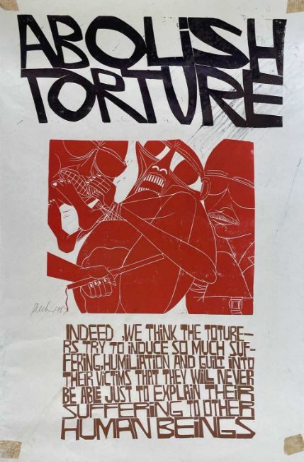 PAUL PETER PIECH three-colour lithograph - with verse relating to the abolition of torture, signed and dated 1987