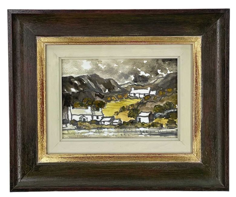 WILF ROBERTS mixed media - whitewashed cottages in the shadows of Snowdonia, signed