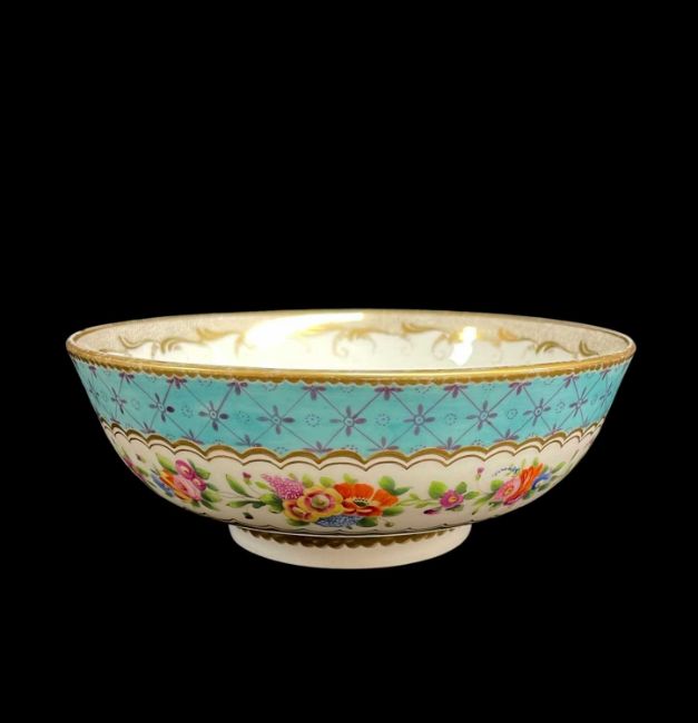 NANTGARW PORCELAIN TEA BOWL circa 1817-1820, of circular footed form, the exterior finely decorated with a garland of vibrant flowers flanked by bands of diamond tiling joined by four-spoked motifs within birds-egg blue reserves, the interior with seeded and scrolling gilt-work and with a central posy of flowers, 17.5cms diam Dimensions: 17.5cms diamProvenance:private collection Gwent, consigned via our Cardiff office, photographed reference to this decoration in 'Nantgarw Porcelain' by W D John, Illustration 32aCondition Report:wear, esp. interior decoration #