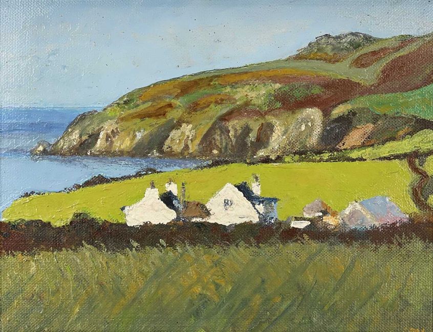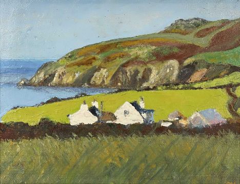 MARGARET LEAH JAGGAR oil on board - whitewashed farm buildings with bay beyond, entitled verso 'Church Bay', signed verso and dated 1971