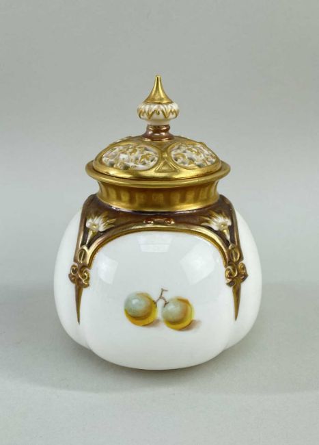 ROYAL WORCESTER FINE BONE CHINA POT POURRI JAR & COVER, hand-painted with a still life of fruit on a mossy bank within gilt borders, pierced cover, indistinctly signed 'Roberts', shape No. H/175, printed mark in black to base