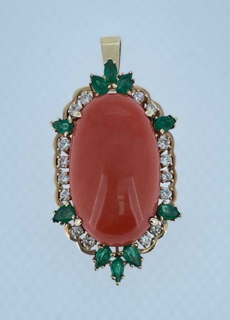 14CT GOLD CORAL, DIAMOND & EMERALD PENDANT, the large central cabochon coral (28 x 17mms) within border of sixteen diamonds and ten emeralds, stamped '585', 22.3gms