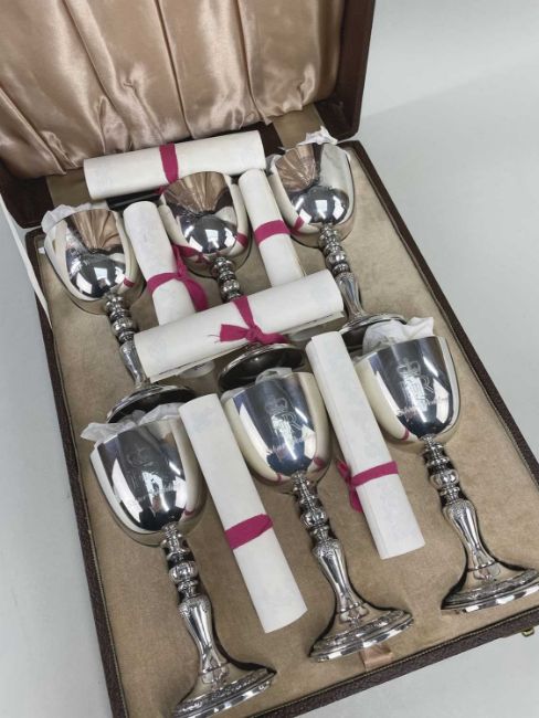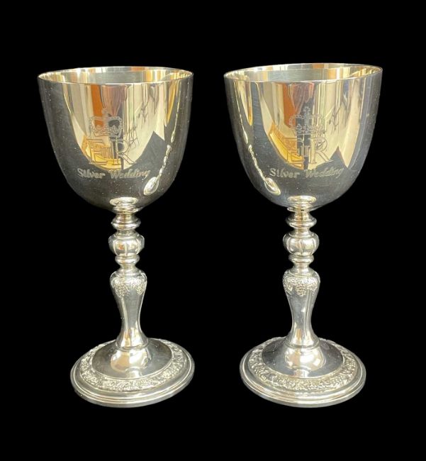 CASED SET ELIZABETH II & DUKE OF EDINBURGH LIMITED EDITION SILVER WEDDING ANNIVERSARY COMMEMORATIVE GOBLETS, Garrard, London 1973, no. 2384/2500, with baluster stems, decorated with fruiting grape vines and engraved with the Royal cyphers, anniversary dates and numbered bases, with accompanying certificates, tot appr wt 36ozt (6)